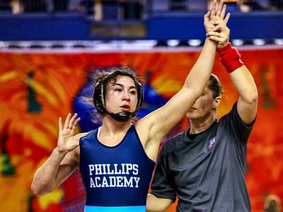 Leading the way was senior co-captain Dani Nugent ’25 (pictured), who competed at 140 lbs. She won her first three matches all by first-period pin (1:05, 0:21, and 0:53) en route to the finals, where she faced off with the returning champion. Dani dominated her final match, getting the first takedown and putting her opponent on her back in a cradle. In the second period, Dani was able to get a reversal and more back points. She won the match 13-6, and is Andover’s first-ever Beast of the East champion. (Nugent is ranked #7 nationally at 130 lbs. The opponent she defeated in the finals is ranked #3 nationally at 140 lbs).