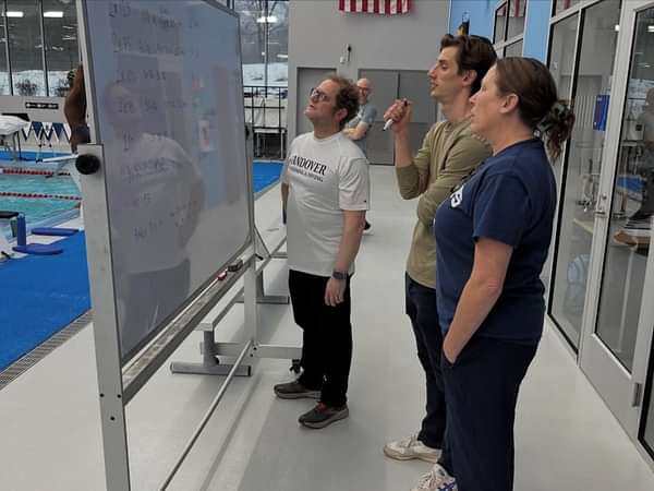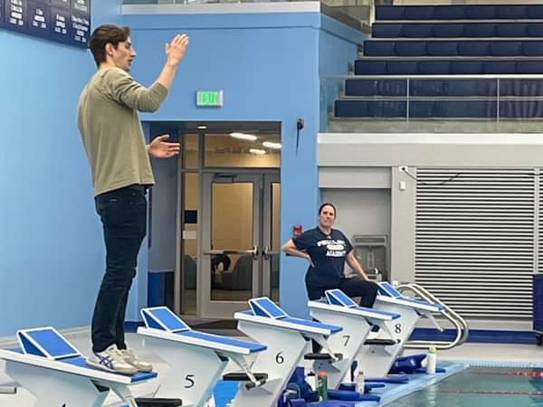 Later in the day, Andrew met separately with the members of the swimming teams and led their Friday night practice. On Saturday morning, he led a breaststroke clinic and then he helped coach the teams during the Deerfield meet.